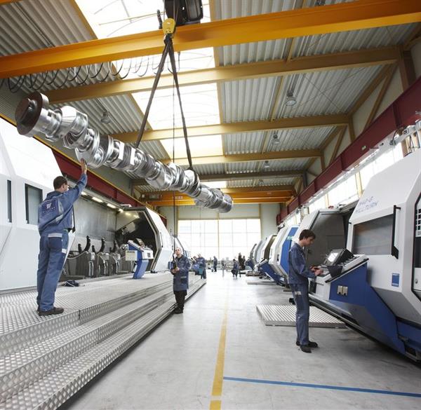 Ebenfalls wird eine Drehmaschinen-Lösung T100/6500 mm mit zwei Revolvern und zwei Lünettenschlitten auf dem Schrägbett-Guss-Konzept vorgestellt. Es werden aus der Kunststoffindustrie Holme aus Vergütungsstahl vorgeführt. Ein Werkstoffgewicht bis 15 Tonnen ist für die 4-Achs-Bearbeitung möglich.